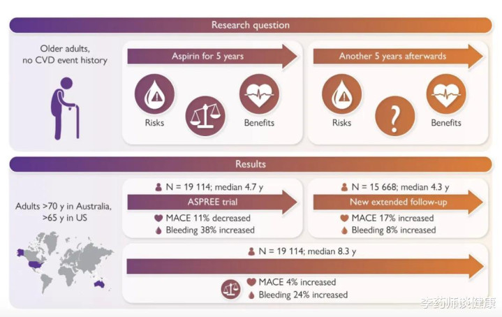在这个历练中还发现,在历练后期,弥远服用阿司匹林的老年东说念主,在所有这个词这个词随访时间,心血行状件的发生率出现了显赫的升高。探求数据清爽,在随访后期,阿司匹林用药组的老年东说念主,主要心血行状件的发生风险升高了18%,心梗发生率升高了25%。
