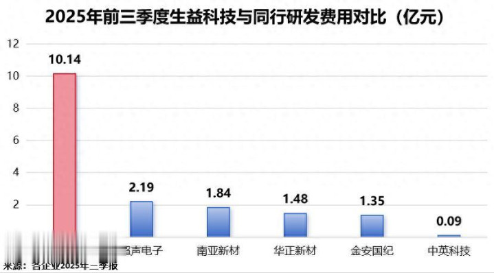 2025年前三季度,生益科技的研发用度高达10.14亿元,同比增幅达28%。这一金额不仅远超超声电子、南亚新材等五家同业,更显耀高于五家同业的研发用度之和(6.94亿元)。