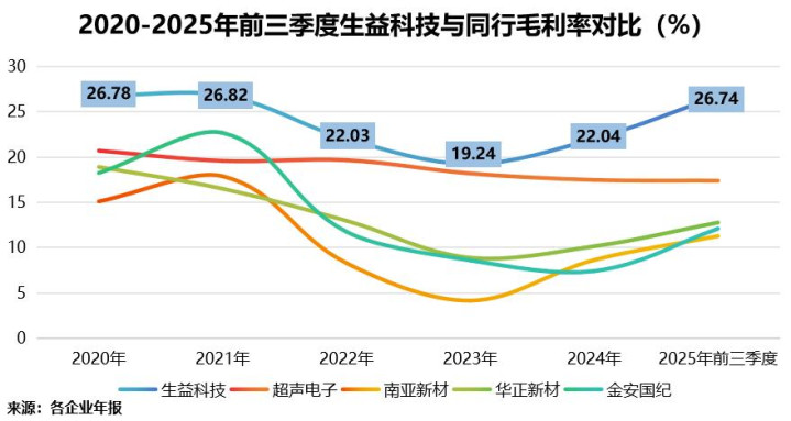 2020-2024年,生益科技的毛利率基本保管在20%以上,远超超声电子、南亚新材、华正新材、金安国纪等同业;且在2025年前三季度归附至26.74%。