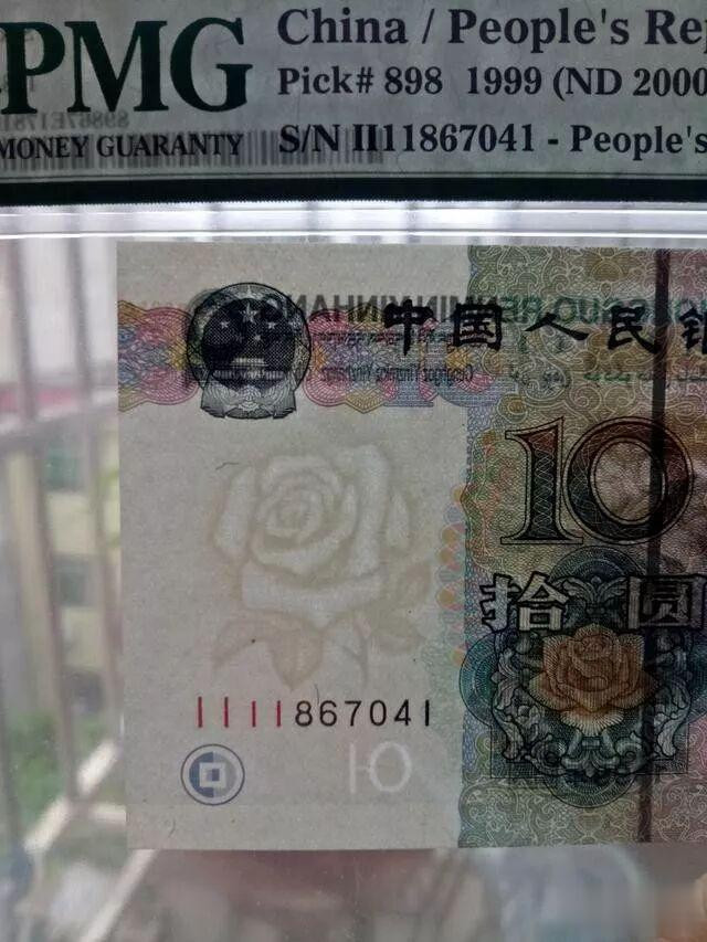 这张10元纸币的冠号是“II”。你第一次看到可能会以为是两个大写字母 I,但在保藏界,它们有一个相等形象的混名——“数字冠”。顾名想义,即是从视觉上看起来像数字的冠号,而“II”这一组合,看着就像“11”。数字冠本人就相等荒废,加上9910正本存量就少,数字冠出现的概率就更低。