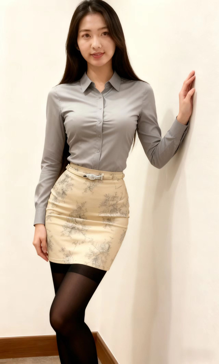 上班一稔: 长款衬衫搭配闲静卡其色的商务裙装, 闲静氛围感。